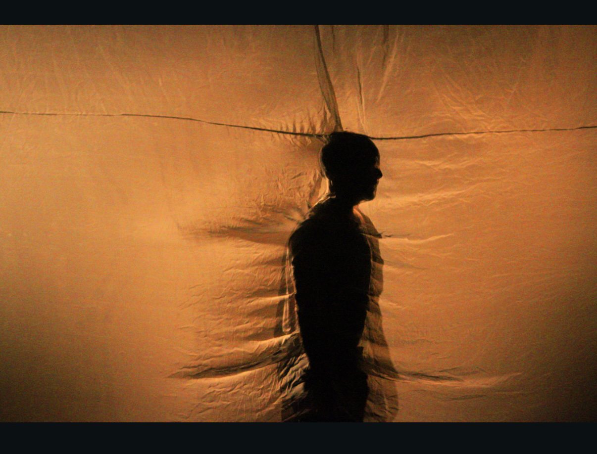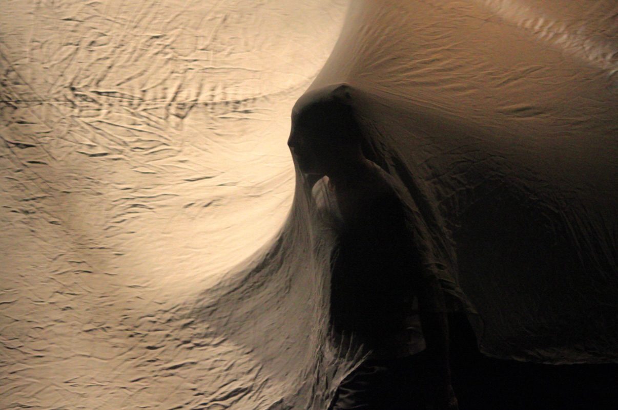 A dark stage with a cloth showing the shadow of someone standing behind it.